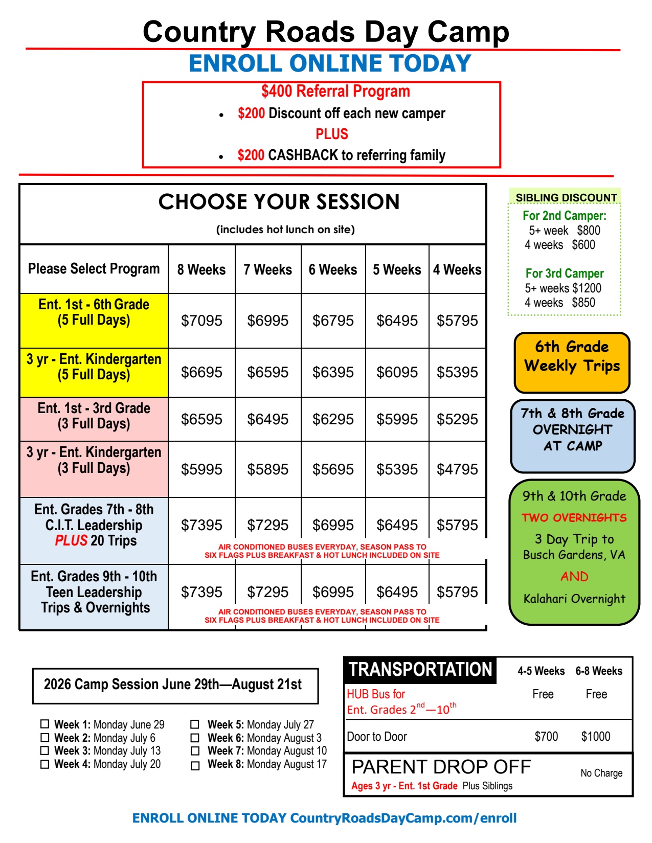 Country Roads, situated on a beautifully shaded, 26-acre campus offers sessions to meet your family’s needs for children ages 3 through 15. Sessions from 4 to 8 weeks, 5 days a week, as well as flexible 3 full day sessions for our youngest campers