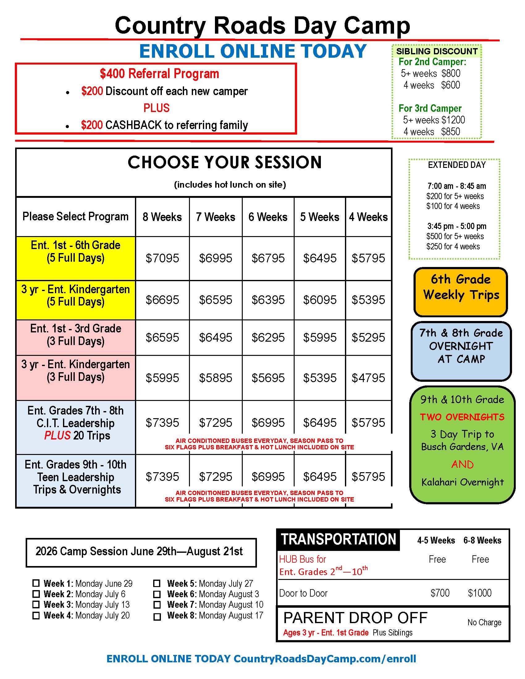 Country Roads, situated on a beautifully shaded, 26-acre campus offers sessions to meet your family’s needs for children ages 3 through 15. Sessions from 4 to 8 weeks, 5 days a week, as well as flexible 3 full day sessions for our youngest campers
